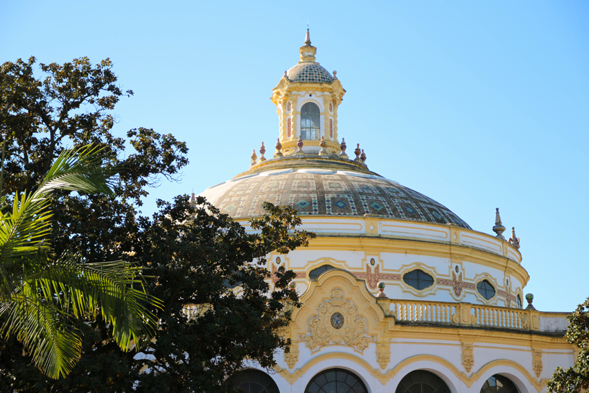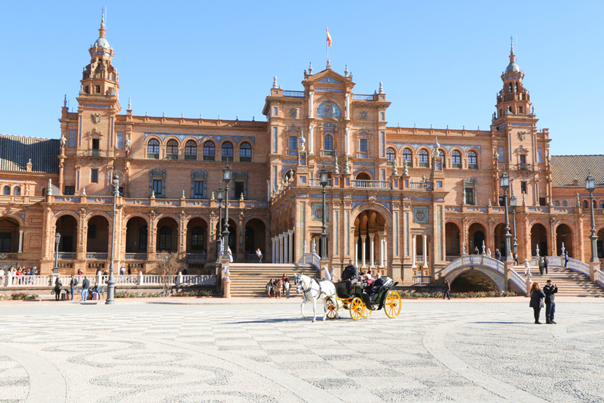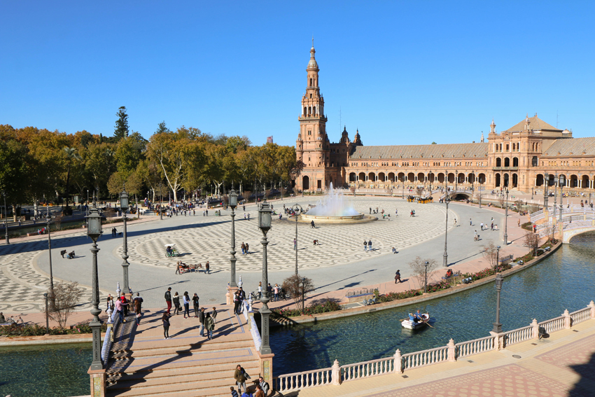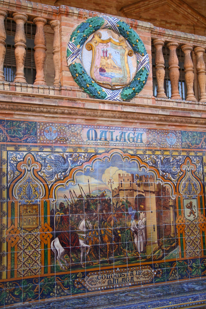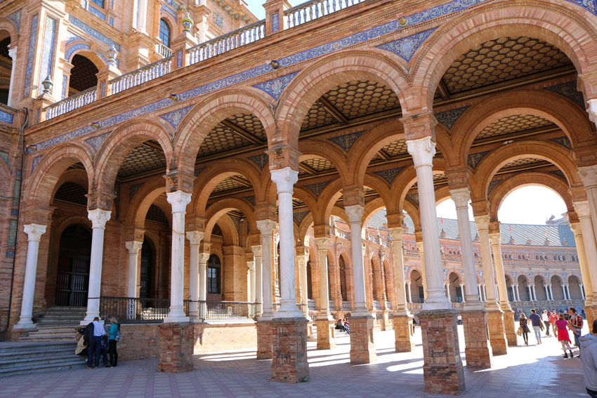 Unser erster Weg führte uns zum Plaza de España, der der bekannteste Platz in Sevilla ist. Als Sevilla Anfang des 20. Jahrhunderts die Iberoamerikanische Ausstellung veranstaltete, wurden dafür etliche Gebäude im Maria Luisa Park errichtet, unter ihnen eben auch jene Gebäude rund um den Plaza de España. Rund um den Platz befindet sich ein Kanal mit 515 Meter Länge, den man auch – venediglike – mit einer Gondel beschippern kann. Der Kanal wird von 4 kleinen Brücken überquert, welche die vier alten Königreiche Spaniens repräsentieren sollen. Der Plaza de España war auf alle Fälle mein Sevilla Highlight, da er durch das Marmor und die Keramiken wirklich prunkvoll wirkt, was leider auf den Fotos aber nur halb so gut zur Geltung kommt.