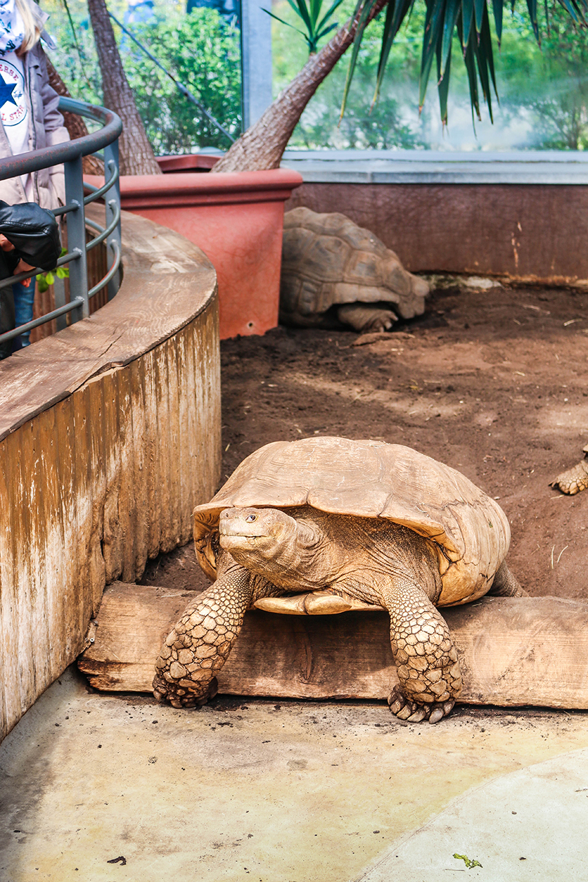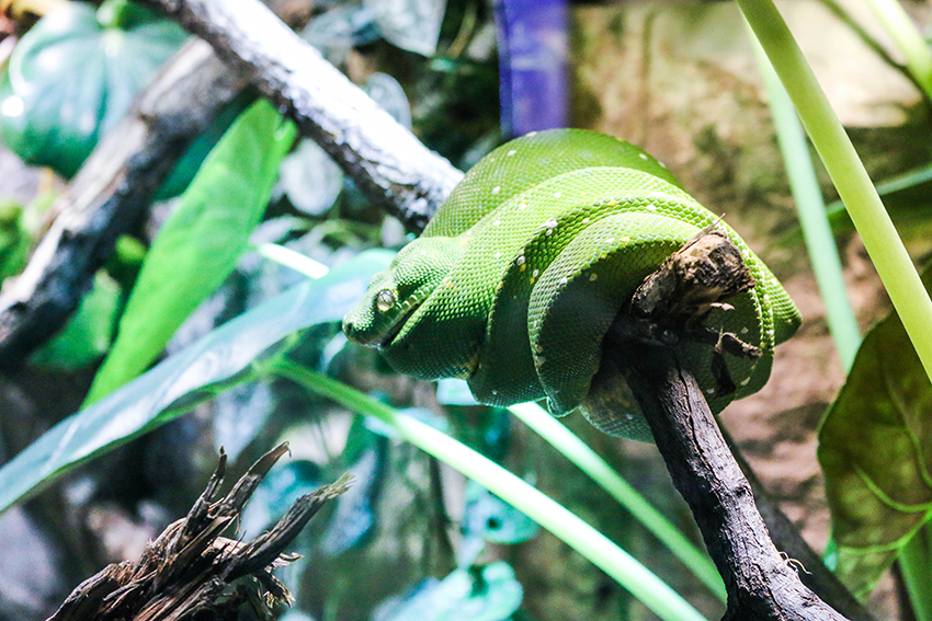 Unser erster Weg – nachdem wir den Zoo betreten hatten – führte uns vorbei an den Giraffen Richtung Aquarium. Hinter den denkmalgeschützen historischen Fassaden verbirgt sich eines der artenreichsten und modernsten Schauaquarien der Welt. Auf drei Etagen leben hier nicht nur unzählige Fische, Quallen, Schnecken und Muscheln, sondern auch Reptilien, Insekten und Amphibien. Gleich in der ersten Ebene geht’s um die Wurst… ähm Fisch, natürlich! In über 70 Aquarien kann man farbenfrohe und teils ziemlich exotische Fische betrachten. Neben Welse, Karpfen, Scheibensalmler, Seepferdchen, Rochen, ist hier auch „Nemo“ und natürlich „Dori“ untergebracht. Aber auch Haie lassen sich hier beobachten und bei den Becken der Seepferdchen und der Quallen wollte ich gar nicht mehr weg. Erstaunlich, wie viele Arten von Quallen es doch gibt und wie schwerelos sie durchs Wasser gleiten. Während meine Begleitung sich erstmals die Füße in der kleinen Aquarium-Cafeteria ausruhte, machte ich mich auf den Weg zu den Reptilien. In der Großanlage tummeln sich zwischen tropischen Pflanzen Waldschildkröten und Grüne Leguane. Ein paar Schritte weiter warten Riesenschlangen und verschiedene Echsen darauf besucht zu werden. Im letzten – und für mich persönlich eher uninteressantesten Stock – geht es zu den Amphibien und Insekten. Hier kann man in Ruhe Stubenfliegen, Blattschneideameisen, Bienen und Heuschrecken beobachten und gut getarnte Frösche in ihren Terrarien suchen.