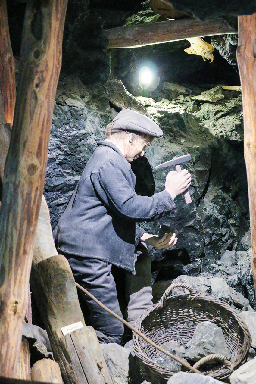 Die Ausstellung ist in vier Teile gegliedert und man startet im Schaubergwerk, in dem man in die unterirdische Welt des Bernsteiner Felsenmuseums eintaucht. Sowohl für Kinds, als auch für Erwachsene wird dort die Bergbaugeschichte des Ortes ansehnlich präsentiert und erzählt. An Hand von naturgetreuen Modellen werden die verschiedenen Abbaumethoden des Edelserpentins, den ersten Grabungen im Stollen bis zum heutigen Tagebau in modernen Steinbruchanlagen dargestellt. Im überdachten Freilichtbereich stehen zudem viele historische Maschinen und Werkzeuge, die teilweise bis zuletzt noch im Einsatz waren, bereit. Obwohl ich mich nicht für den Bergbau interessiere, sind die Exponate wirklich so toll in Szene gesetzt, dass man sich gerne etwas länger umsieht.