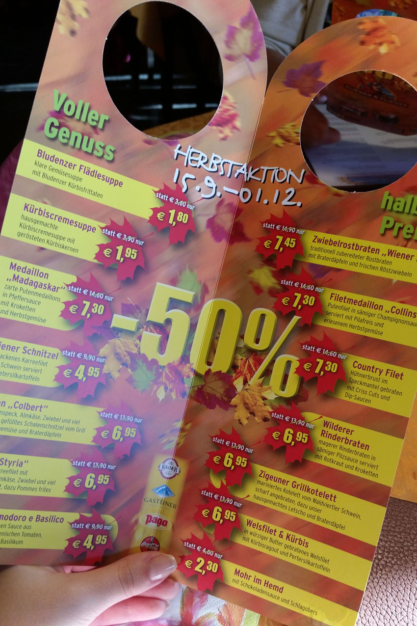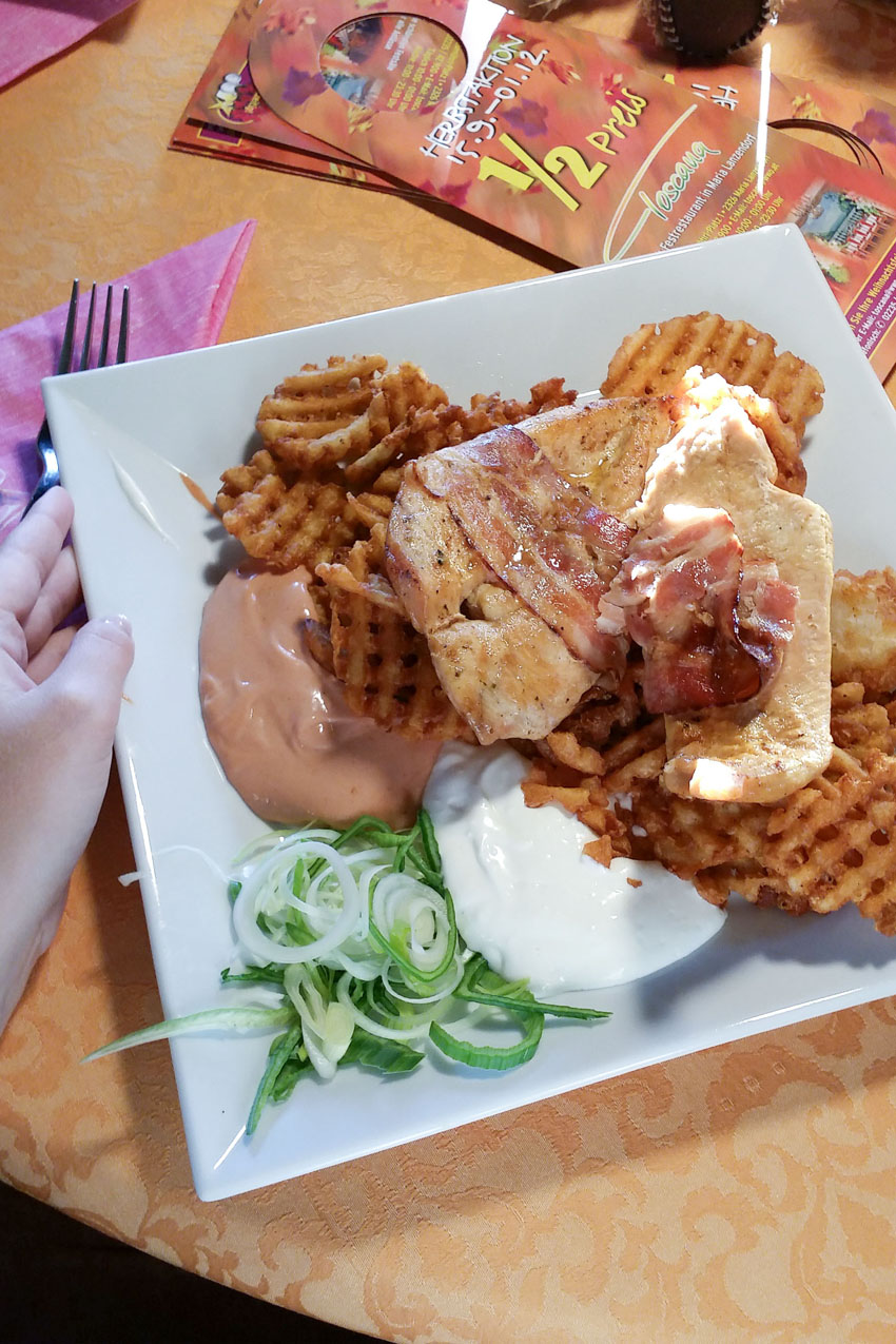 Noch ein kleiner Food-Tip am Rande: Im Restaurant Flieger – Flieger in Laxenburg gibt es bis 01.12. 50% Rabatt auf viele leckere Speisen. Ich bin in der „Flieger Bar“ doch recht häufig essen und finde sowohl die Speiseauswahl als auch die Speisen selbst richtig klasse. Zu den günstigeren Restaurants gehört Flieger – Flieger zwar nicht, aber die großen Portionen machen dies auf alle Fälle wett. Außerdem gibt’s ja dank Herbstwochen auf viele Gerichte Rabatt. 🙂 Nach dem üppigen Essen kann man sich dann auch gleich die Beine im Schlosspark Laxenburg vertreten.