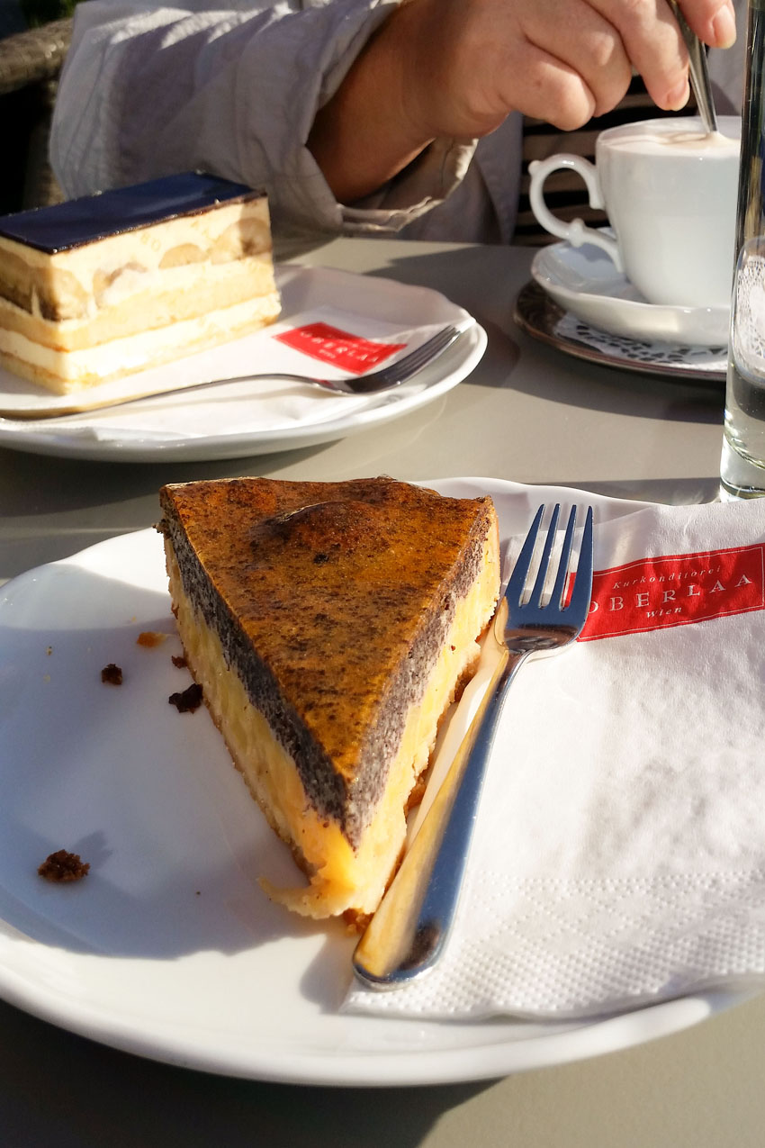 Und wenn wir schon beim Spazieren in Wien sind, dann kann ich euch den Kurpark Oberlaa nur wärmstens ans Herz legen. Die letzten Wochen war ich gleich 3x dort, da ich finde, dass er einer der schönsten Parks in Wien ist. Die Parkanlage, die sich im 10. Wiener Gemeindebezirk befindet, erstreckt sich auf rund 860.000 m² und bietet wirklich viele Attraktionen. Neben ein paar Restaurants und Kioske, die für Erfrischung sorgen gibt es viele Spielmöglichkeiten für Kinder, ein Skatend, einen Streichelzoo mit Ziegen, einen Allergiegarten, wo man vor den jeweiligen Pflanzen angebrachten Schautafeln die verschiedenen Pollenflugzeiten, die Verbreitungsräume und weitere botanische Informationen entnehmen kann, einen kleinen barocken Brunnengarten mit schattigen Sitzmöglichkeiten, ein Blumenlabyrinth mit einem Durchmesser von 18 Meter, der Filmstadt, einem kleinen Japanischen Garten mit Steinbrücke, dem Liebesgarten und und und… Ich war echt schon einige Male im Kurpark Oberlaa und entdecke jedes Mal aufs neue interessante und schöne Plätzchen. Eingekehrt sind wir diesmal übrigens in der bekannten Kurkonditorei Oberlaa, wo es für mich eine leckere Apfel-Mohn-Torte sein durfte.