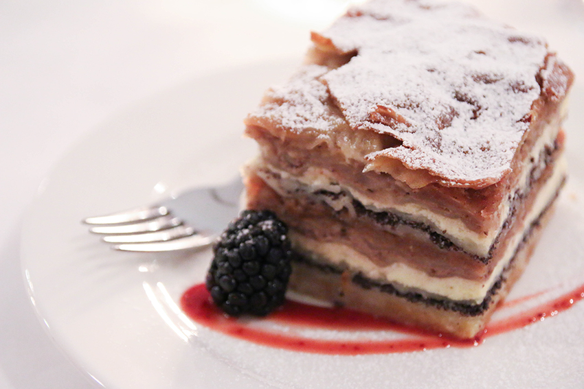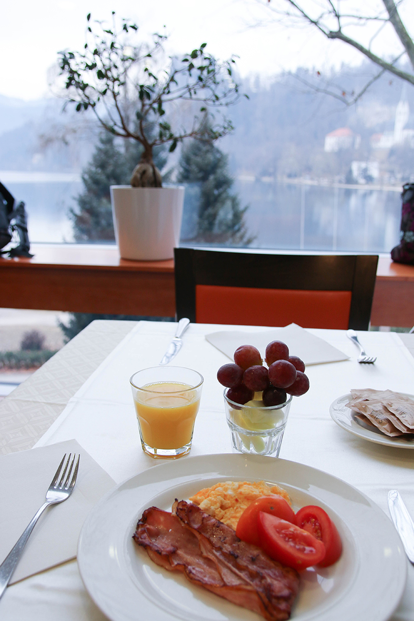 Während man eine herrliche Aussicht auf den Bleder See hat, werden einem hier typisch slowenische Gerichte serviert. Zu Beginn darf natürlich nicht die berühmte Pilzsuppe (Corba Od Pecurki Sa Krompirom) mit Buchweizen fehlen. Den Abschluss des Menüs machte allerdings nicht die Cremeschnitte, sondern Prekmurska gibanica, welches ein wahnsinnig leckerer, aber extrem ausgiebiger Mohn-Apfel-Nuss-Topfenkuchen ist.
