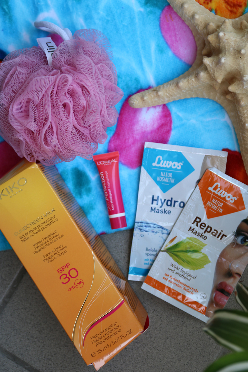 Bei der Hitze darf natürlich auch der Sonnenspray nicht fehlen… Auch eine handliche Creme in Reisegröße und 2 Gesichtsmasken für gestresste Haut packe ich mit drauf. Ein After Sun Haarserum ist sicher nicht für jeden das „Must Have“, jedoch gerade bei trockenen oder blondierten Haaren sehr zu empfehlen!