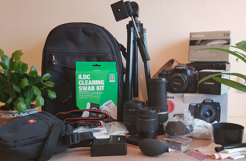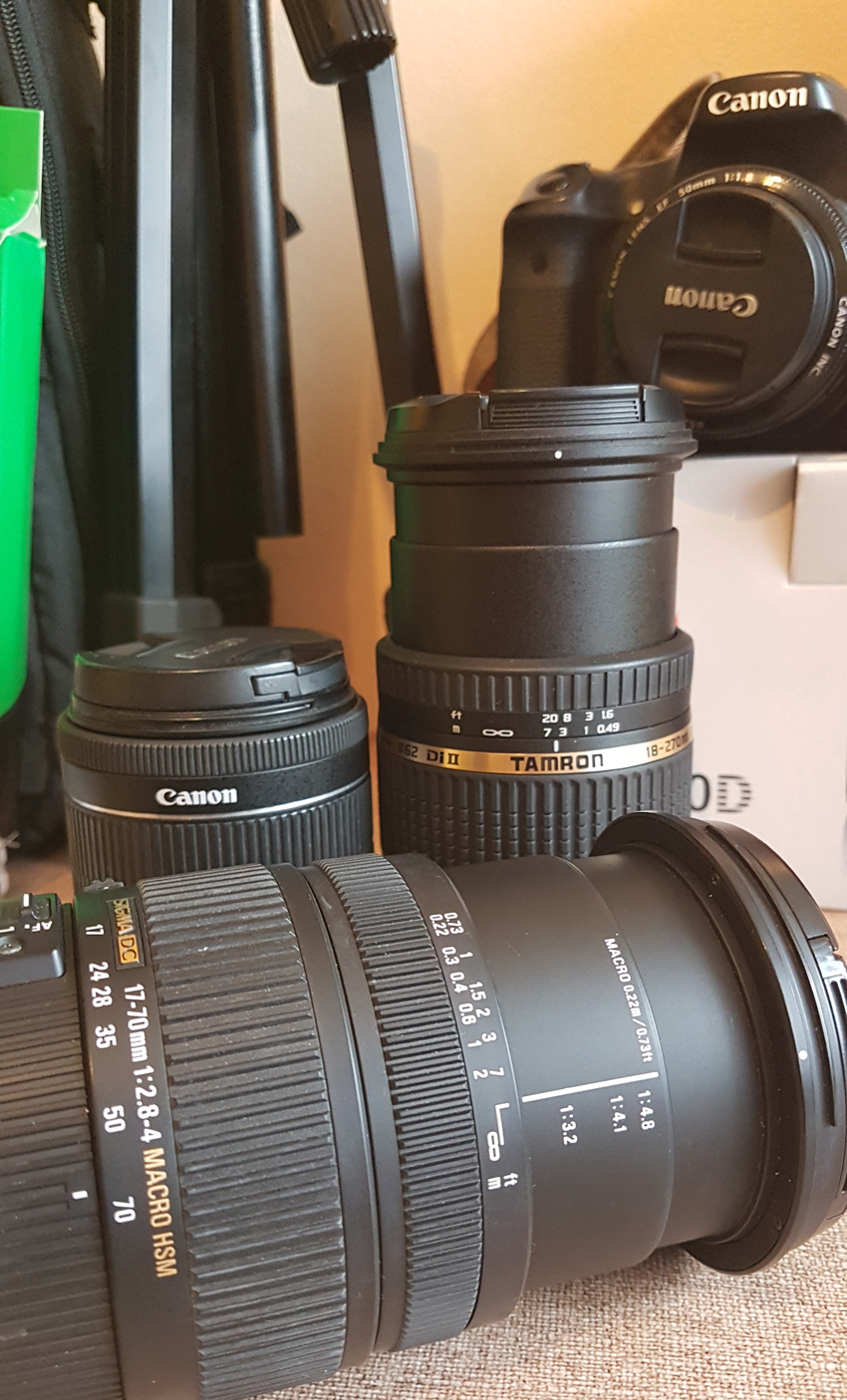 Schweren Herzens trenne ich mich nun also von meiner kompletten Kameraausrüstung und möchte sie gerne auch hier anbieten. Die Kamera selbst habe ich Ende 2013 gekauft und sie hat „normale“ Abnutzungserscheinungen. Hauptsächlich wurde die Kamera Indoor oder „vor der Haustür“ für Bloggerfotos genutzt. Auf meinen Städtetrips war sie 10-12x mit von der Partie, meist aber gut geschützt in ihrem Täschchen. Nur von der Asienreise hat sie leider 2-3 kleinere Schrammen am Gehäuse mit nach Hause gebracht, da ich sie leider einen Tag ungeschützt im Rucksack hatte. 🙁 Sie ist allerdings nie runtergefallen und funktioniert einwandfrei. Das am meisten benutzte Objektiv war definitiv das Sigma, welches demnach die meisten „Abnutzungserscheinungen“ hat. Das Canon Kit Objektiv und die 50 mm Festbrennweite wurden in den 4-5 Jahren selten und nur sehr gezielt benutzt, daher wie neu. Das Tamron-Teleobjektiv ist das Jüngste im Rudel (etwas mehr als 1 Jahr) und wurde leider nur 2x benutzt. Zu den Objektiven gibt es auch noch Gegenlichtblenden, die allesamt unbenutzt sind. Außerdem ist im Set auch noch ein Polfilter enthalten, der unerwünschte Reflexionen von glatten, nichtmetallischen Oberflächen (z. B. Wasser, Glas) unterdrückt. Gerade wenn man Wasserflächen oder in Tierparks die Aquarien fotografiert möchte, ist er einfach ein MUSS. Außerdem wird die Grünwiedergabe von Laub und Gräsern auf Fotos verbessert. Ebenfalls lege ich auch noch 2 Akkus (einmal original Canon, einmal ein Nachbau), das Ladegerät, 2 neuwertige Kameragurte, ein Reinigungsset, einen unbenutzen Kamerarucksack, eine gern genutzte kleine Kameratasche und ein altes (nicht besonders gutes) Stativ inklusive Fernauslöser bei. Zum Stativ sei gesagt, dass es echt schon einige Jahre auf den Buckel hat und ich es nicht für unterwegs empfehlen kann, da es deutlich bessere und leichtere gibt. Als Anfängerausrüstung und für Indoor-Fotografie ist es aber noch in Ordnung.