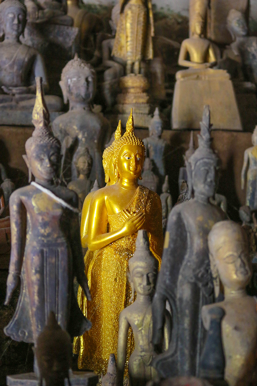Etwa eine halbe Stunde später erschien auch schon unser nächstes Ziel am Horizont: Die sagenhaften Kalksteinhöhlen Pak Ou. Die Pak Ou Höhlen bestehen aus zwei Höhlentempeln: Der Unteren Höhle (Tham Theung) und der Oberen Höhle (Tham Ting) und sind seit tausenden von Jahren eine Pilgerstätte für Gläubige. Viele der Gläubigen ließen im Laufe der Jahre auch Buddha-Statue nach ihrer beschwerlichen Anreise zurück, weswegen die Pak Ou Höhlen auch gerne „Buddha-Höhlen“ genannt werden. So schätzt man, dass heute etwa 4.000 davon in der Höhle vorzufinden sind. Da die erste der beiden Höhlen nicht sonderlich groß ist und sich die Touristen doch ziemlich drängen, ist man in maximal zwei Minuten mit der Höhle durch. Aber es gibt ja etwas weiter den Berg hoch noch eine zweite Höhle, die man besichtigen kann. Der steile Weg hinauf ist etwas mühsam, wenn man ohnehin schon halb ausgetrocknet, leicht genervt und unsportlich ist. Zudem stehen gefühlt jeden Meter kleine Kinder, die einem alles mögliche an Souvenierkram andrehen wollen. Oben angekommen befindet man sich dann vor der größeren und tieferen Höhle, die zudem teilweise auch noch stockdunkel ist. Ganz ehrlich: Mein einziges Highlight dieses Zwischenstops war die nette Aussicht auf den Mekong und die umliegende Landschaft. Die Höhlen selbst fand umspektakulär und dass einem alle paar Meter alles mögliche verkauft werden sollte, zudem auch noch furchtbar nervig.