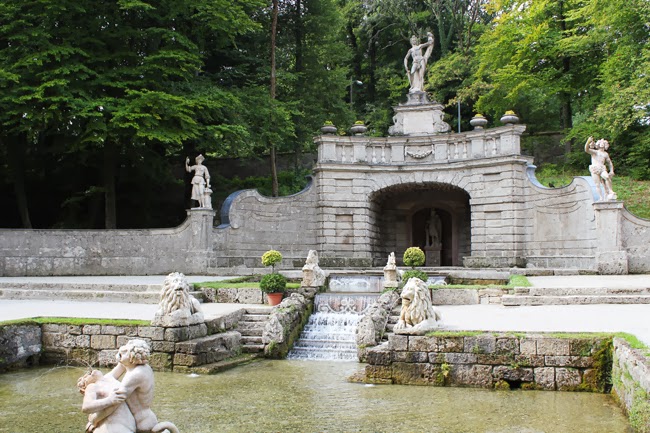 Heute gibt es den letzten Teil meiner Salzburg-Reihe. Am letzten Tag unseres Wochenendes ging’s auf der Rückfahrt ins Schloss Hellbrunn. Das Schloss mit der historischen Parkanlagen ist mit dem Auto etwa 15-20 Minuten von der Salzburger Innenstadt entfernt und vor allem wegen seiner Wasserspiele bekannt. Sie sind die weltweit besterhaltenen Wasserspiele der Zeit der späten Renaissance. Die Führung dauert nicht besonders lange, ist aber dennoch ganz interessant. Vor allem kann man sich sicher sein nass zu werden. Fotografieren ist daher keine schlaue Idee, und man wird auch mehrmals darauf hingewiesen besser seine Kamera verstaut zu lassen. Ich hatte zwar vor zu fotografieren, aber nachdem ich schon zu Beginn zweimal überraschenderweise angespritzt wurde, habe ich dann meine Kamera doch sicher in der Tasche verstaut. Gute Idee, denn gegen Ende hin war ich komplett nass! Zum Glück war’s an dem Tag noch relativ warm, sodass meine Klamotten dann bei dem Rundgang durch den schönen Schlosspark trocknen konnten. Bevor wir wieder Richtung Wien fuhren warfen wir auch noch einen kurzen Blick ins Schloss selbst. Ich persönlich fand die darin befindende Ausstellung nicht sooo spannend, nur die Deckenbemalung hat mich gefesselt…