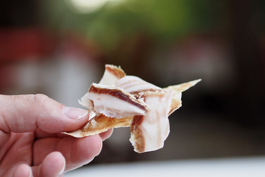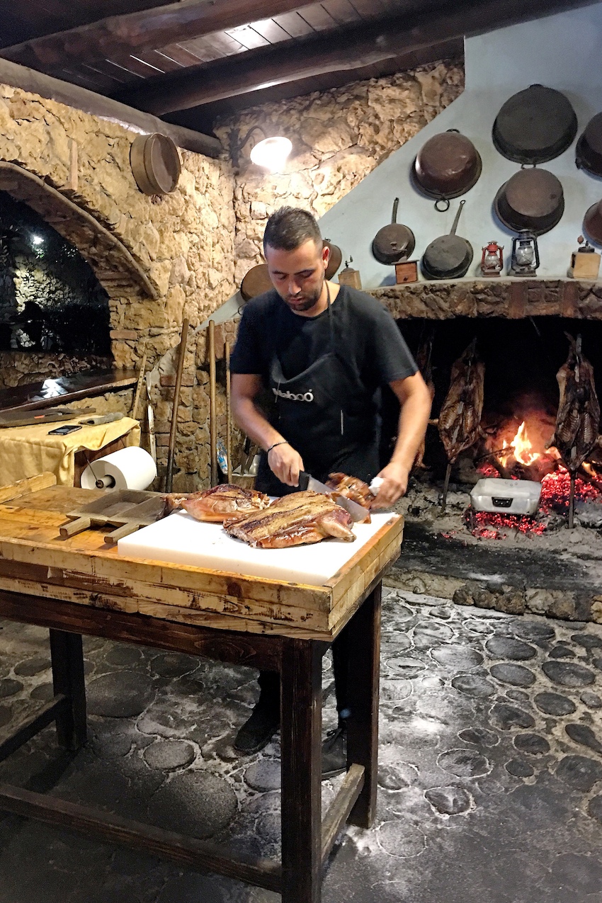 Verzaubert vom Spaziergang durch die Gartenanlage und dem unerwarteten Blick in die Vergangenheit war es nun Zeit für Sardischen Wein mit Oliven und traditionellem Brot mit Speck, als Aperitif am Feuer. Die Vorspeise wurde am Tisch serviert. Gemüse-Antipasti, Ricotta mit Honig, gesalzener Ricotta mit Orangenmarmelade, Prosciutto, Salsiccia und Martinette – alles aus eigener Produktion! Himmlisch für mich als Käseliebhaberin, aber auch für unsere große Tochter, als Vegetarierin, war einiges dabei. Als Zwischengang genossen wir ganz vorzügliche Ravioli. Der Höhepunkt war aber mit Sicherheit der Hauptgang: Spanferkel und frisches Gemüse aus dem Hause Sa Mandra. Nicht zu vergessen die perfekt abgestimmte Weinbegleitung. Welch ein Gaumenschmaus! Da blieb fast kein Platz für das Dessert aus typischem Sardischen Gebäck und süßem Obst übrig.