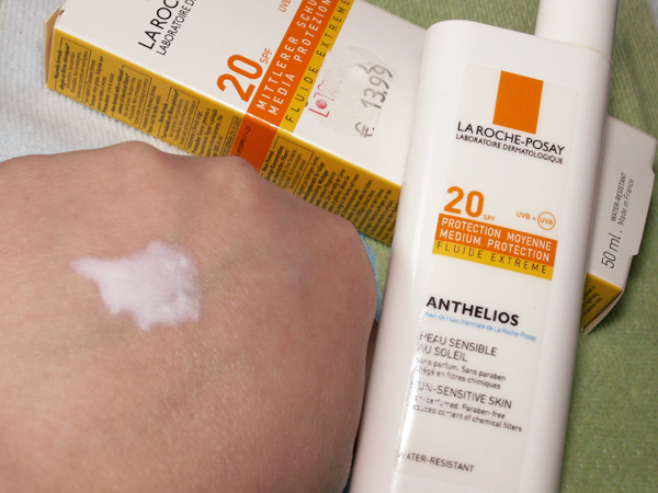 Meiner besseren Hälfte habe ich in der Apotheke das La Roche Posay Anthelios extra für das Gesicht gekauft. Es ist zum Schutz sonnenempfindlicher Haut vor UVA und UVB Strahlen geeignet, mit Thermalwasser versetzt und kommt ohne Duftstoffe und Parabene daher, zudem mit nur einem geringen Anteil chemischer Sonnenfilter. Leider muss ich gestehen, dass dieses Fluid arg nach Sonnencreme riecht, was mir und ihm nicht so gut gefällt. Der Auftrag gestaltet sich dank sehr dünnflüssiger Konsistenz jedoch einfach, nichts klebt oder glänzt übermäßig.