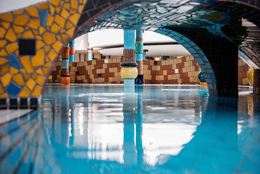 Schon von Weitem sticht einem das extravagante Design der Therme ins Auge. Spätestens wenn man das Gebäude betreten hat, weiß man gar nicht mehr wohin man schauen soll, so viele Plätze, Ecken und Details gibt es hier zu entdecken. Unebene Böden, Lebensbäume, „tanzende Fenster“, bunte Säulen und bewachsene Dächer – hier erzählt alles eine Geschichte. Die Anlage wurde von