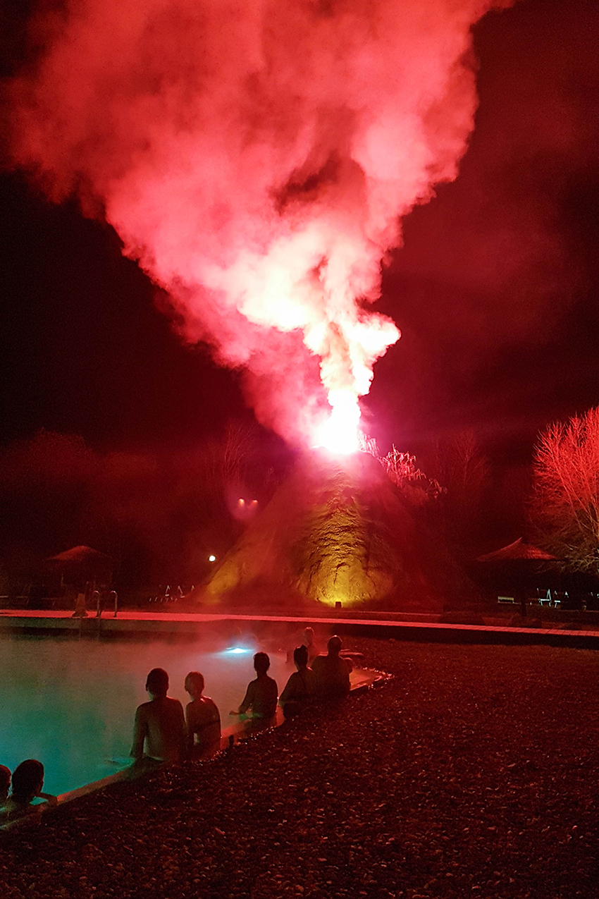 Wie oben schon beschrieben, ist die Vulkania® Badelandschaft etwas ganz Besonderes und war demnach auch mein Lieblingsplätzchen im Rogner Bad Blumau. Ein Vögelchen hatte mir dann aber gezwitschert, dass es sich mittwochs und samstags gegen 21:30 Uhr besonders lohnen würde sich im Vulkania Bereich aufzuhalten. Nicht nur, dass das Schwimmen dort nachts extrem charmant und romantisch ist, da bei Dunkelheit überall knisternde Feuerkörben aufgestellt werden – nein es findet auch ein fünfminütiger Vulkanausbruch mit Mini-Feuerwerk statt.