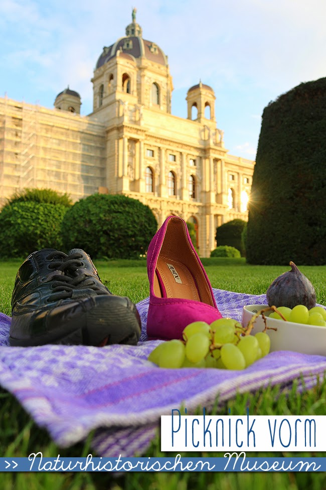 In der Zwischenzeit half ich Herrn Schuh dabei, ein romantisches Picknick vor dem angrenzenden Naturhistorischen Museum vorzubereiten. Die mit Taschen behangene Frau Schuh war nach ihrer Rückkehr vollends verzückt – innig verschlungen genoss das Paar bei frischen Früchten den Sonnenuntergang über Wien.
